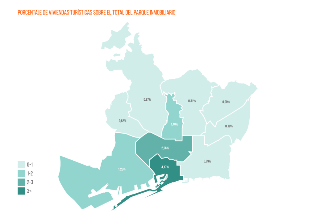 Algo parecido sucede en Barcelona. Distritos como Ciutat Vella o Eixample concentran un 4,17% y un 2,96%, respectivamente, de inmuebles de uso turístico con respecto al total de viviendas. Sin embargo, en el resto de zonas el peso es inferior al 1,5%, e incluso en lugares como Nou Barris, Sant Andreu, Horta Guinardó o Les Corts el peso es prácticamente irrelevante. En el conjunto de la ciudad, si todas estas viviendas recayesen en el mercado de vivienda residencial, el aumento sería del 5,31%.