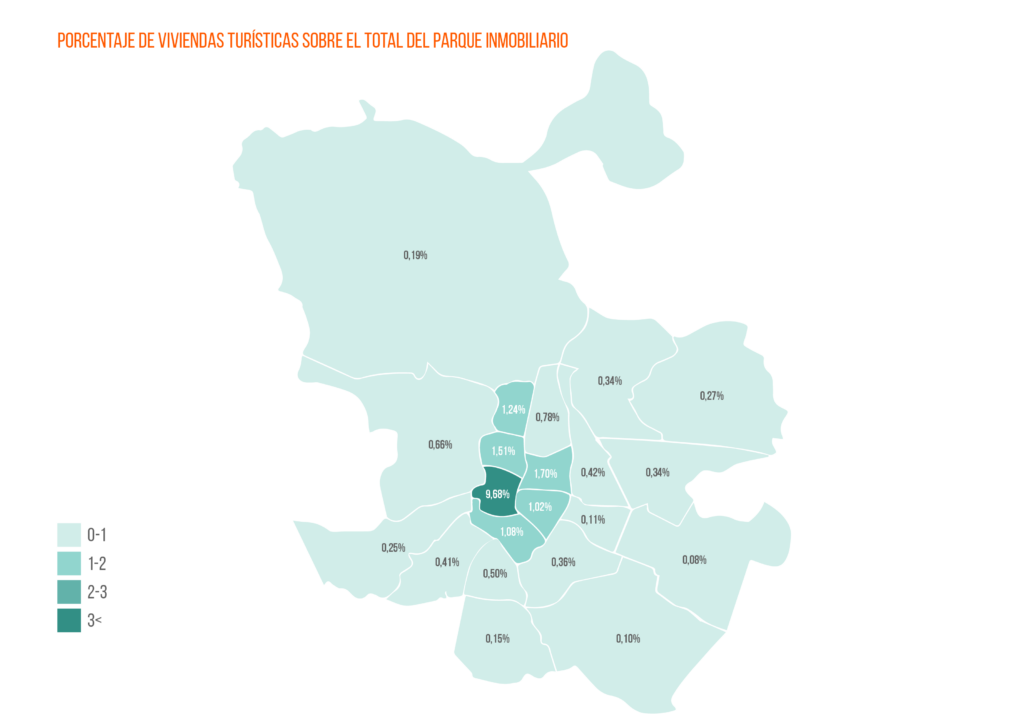 Sin embargo, en el resto de zonas de la capital, el peso de los pisos turísticos sobre el total de viviendas no llega en ningún caso al 2%. De hecho, en la mayoría de distritos, como Vicálvaro, Villa de Vallecas o Moratalaz, su presencia es prácticamente inexistente. En conjunto, si todas las viviendas turísticas recalasen en el mercado residencial, el incremento de la oferta se quedaría en un 5,09%.